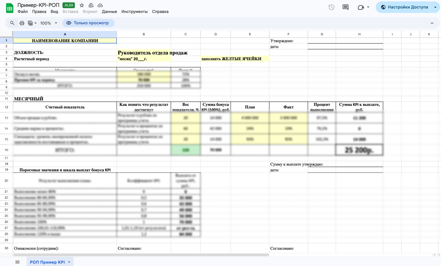 - Выполнение 100% = коэффициент 1 (сотрудник получает 100% оговоренной премии).