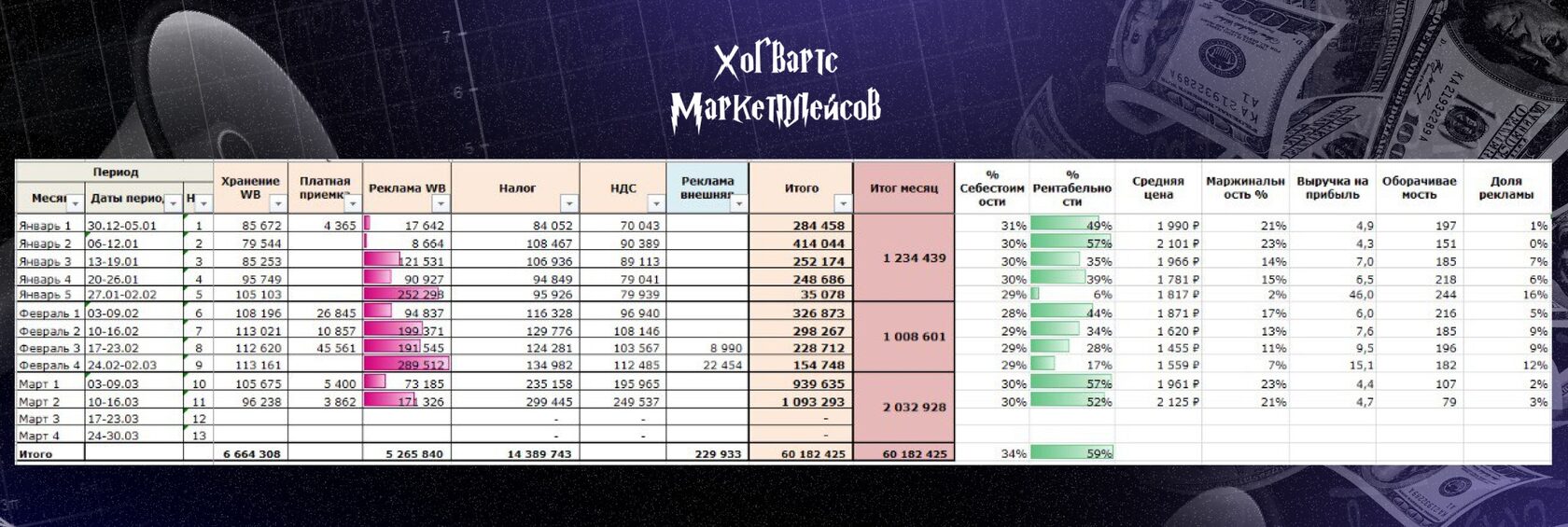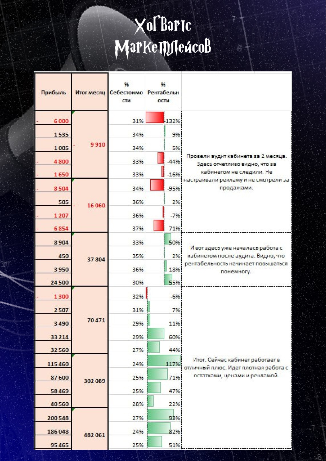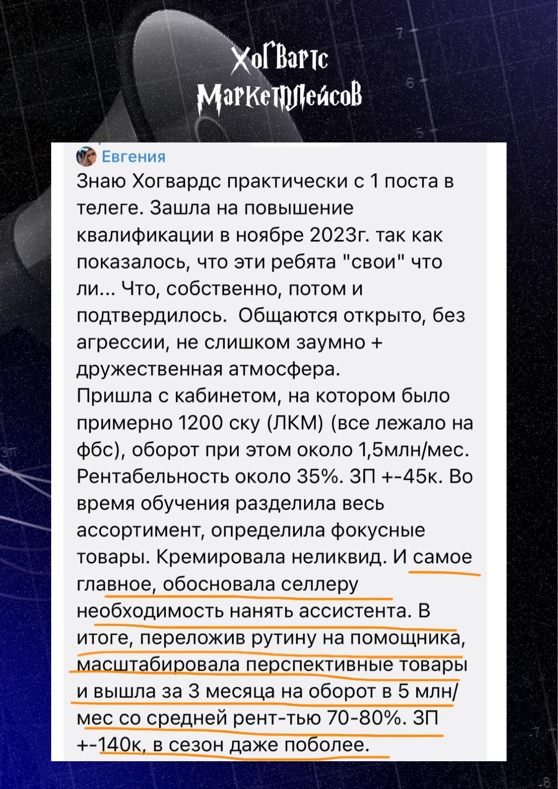 «И самое главное, обосновала селлеру нанять ассистента. В итоге, переложив рутину на помощника, масштабировала перспективные товары и вышла на оборот в 5млн/мес со средней рент-тью 70-80%. ЗП +-140к, в сезон даже поболее» — цитата ученицы Евгении после окончания Курса Повышения Квалификации от Хогвартса.