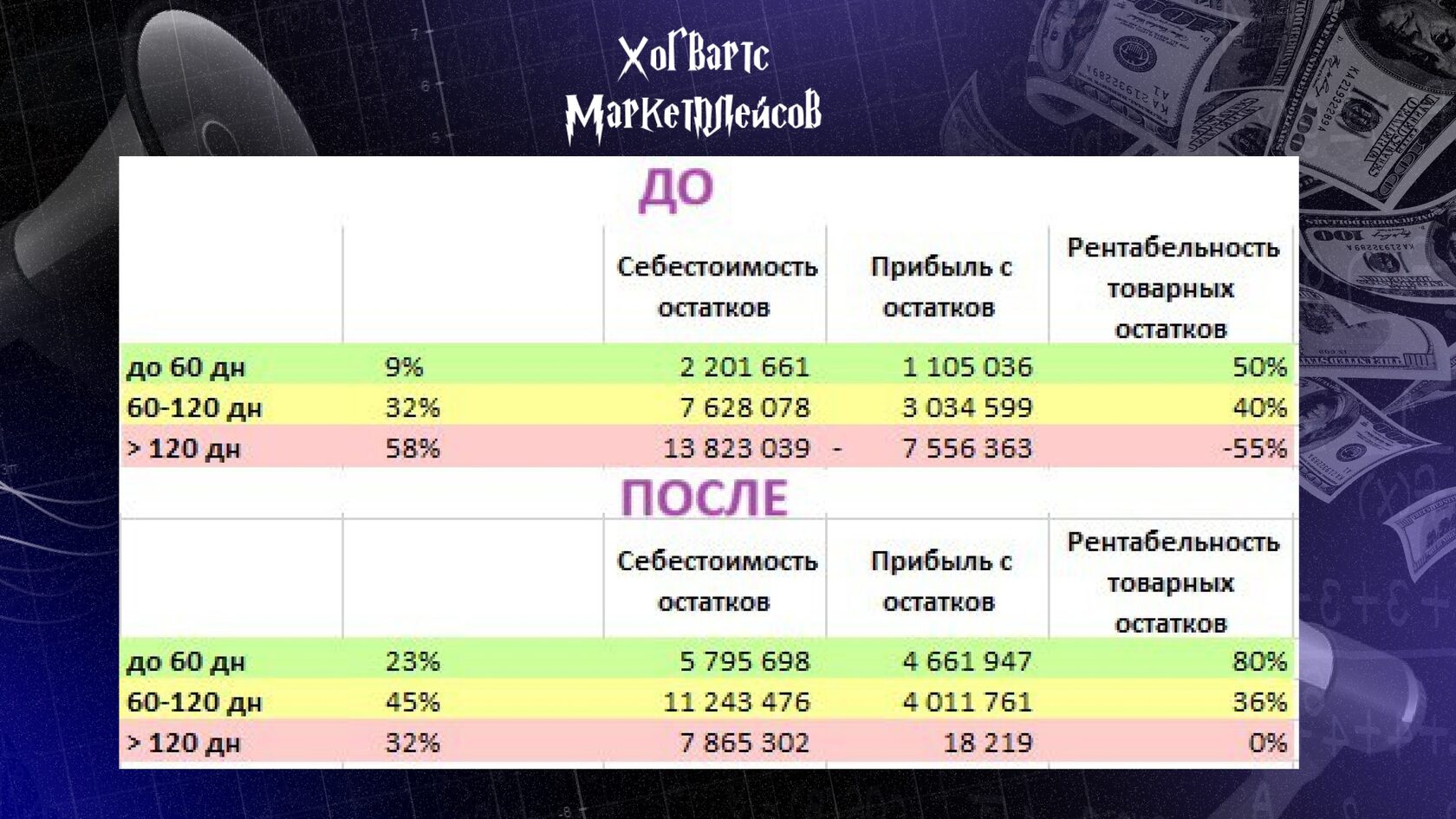 В случае “после” — заработал весь сток с оборачиваемостью более 120 дней и при нарастающей скорости заказов проект стал приносить прибыль. При том же товаре и команде.